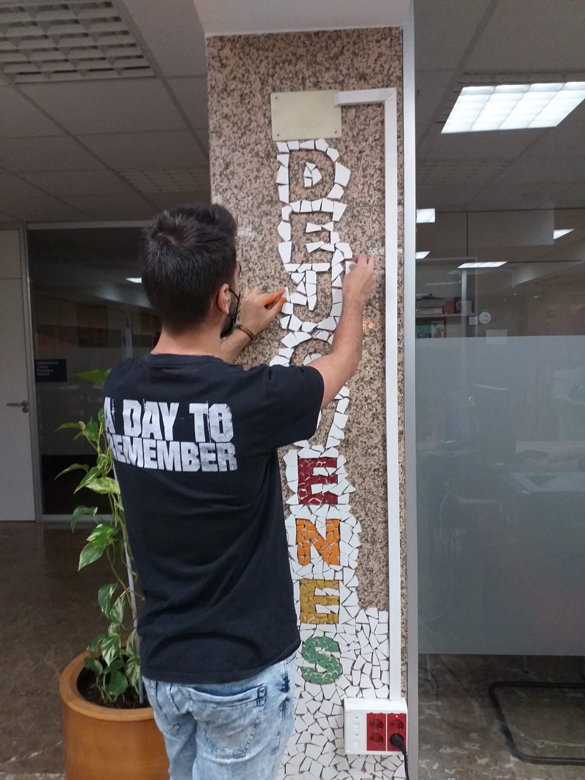 En el Centro Dejóvenes de Plaza de España estamos terminando los talleres con los que hemos redocorado el espacio a gusto de los chicos y chicas que participan. Hemos finalizado de pintar uno de los pilares del centro con pintura de pizarra sobre la que hemos escrito los quince #ValoresDejóvenes. Estamos a punto de terminar el mosaico que hemos colocado en otro pilar reutilizando restos de azulejos y de vajillas rotas. Semanas atrás tapizamos unas antiguas sillas que nos encontramos y reutilizamos latas para plantar unos cactus que trajo una de las chicas que participan en estas actividades. Ahora mismo todas las plazas para este grupo están completas, esperamos poder abrir nuevos grupos próximamente.
