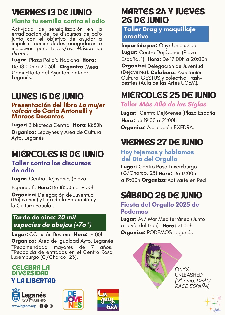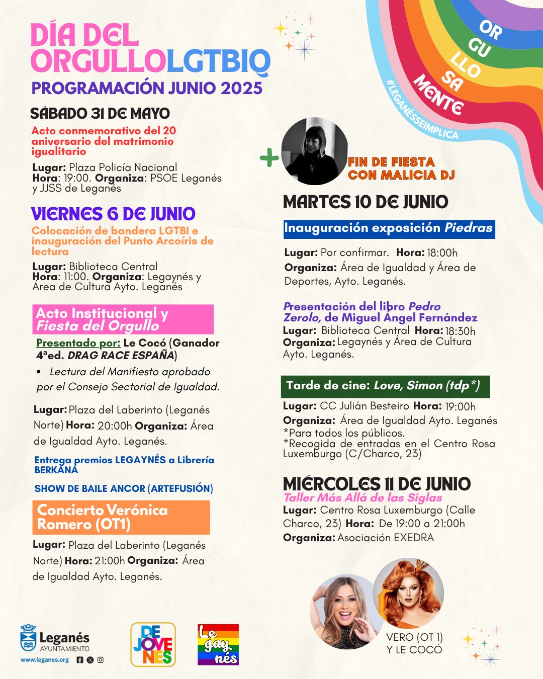 Por segundo año consecutivo el Ayuntamiento de Leganés, a través de las Delegaciones de Igualdad y Juventud (Dejóvenes), ha preparado un nutrido programa ‘Orgullosamente’ para celebrar el Día Internacional del Orgullo LGTBIQ, en colaboración con otras áreas municipales y con Legaynés (Asociación de Lesbianas, Gays, Transexuales, Bisexuales e Intersexuales del sur de Madrid). Leganés abrirá la programación de la plataforma ‘Orgullo en Comunidad’ (MADO’25) el viernes 6 de junio con un potente acto central en la Plaza del Laberinto presentado por Le Cocó, ganadora de Drag Race España, se leerá el manifiesto aprobado por el Consejo Sectorial de Igualdad y habrá un concierto de Verónica Romero, de Operación Triunfo, y el cierre de Malicia DJ.