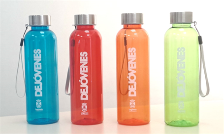 Botella de PET reciclado (RPET). Botella elaborada a partir de la reutilización de plástico usado y, a su vez, reciclable. Capacidad 500 ml. Disponible en color azul, rojo, naranja o verde. Regalo especialmente pensado para los socixs más fieles del Club Dejóvenes :)